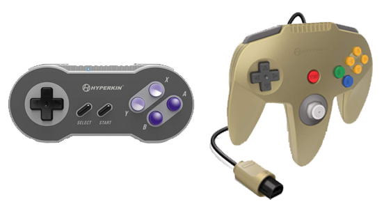 Commençons par Retro Fighters, une compagnie spécialisée en manettes premium, qui a réussi à amener un design moderne aux manettes de Nintendo 64, entre autres. La poigne du milieu n'existe plus ! Maintenant, nous avons droit à un design rappelant énormément les manettes d'Xbox 360. C'est beaucoup plus ergonomique et ça fait changement de la manette officielle. Une version sans fil vient tout juste de sortir et elle est tout aussi incroyable.